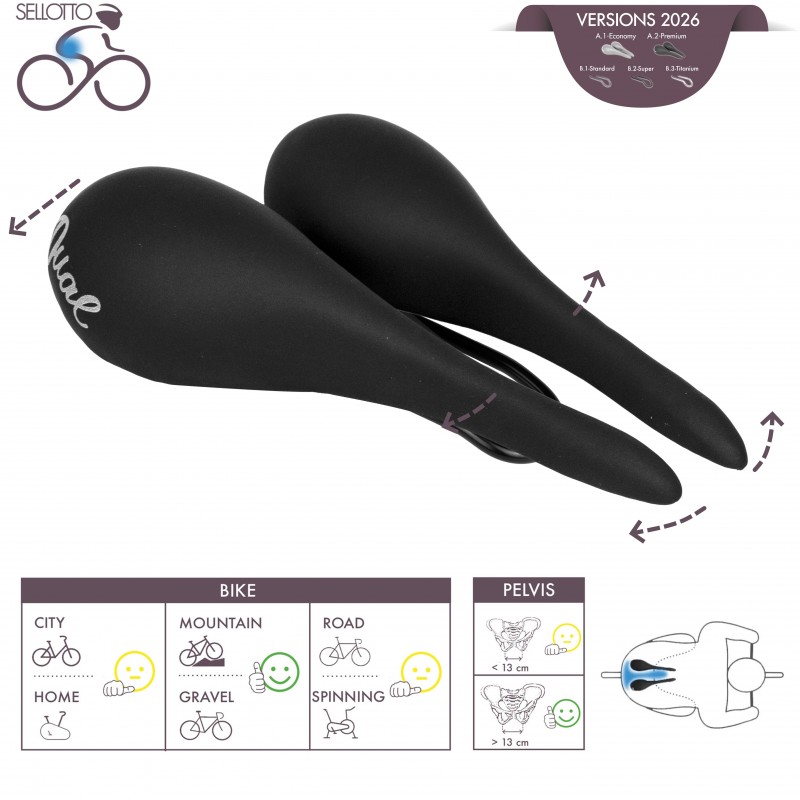 • DUAL - First and only double long "triangular" saddle (patented), fully adjustable (using a pair of screws on the inside of each half-saddle), so you can customise the saddle to your physique, bike use, and own ischial bone width (narrow pelvis - width of ischial bones < 13 cm is normally found in men; wide pelvis - width of ischial bones > 13 cm is normally found in women; a tip from Selle SMP for measuring your ischial bone width). Alternating dampening (thanks to the support rail made from spring steel), both to go along with the leg in extension (with the slight elastic lowering of the relevant half-saddle) and to help the leg in flexion (with the elastic return of the relevant half-saddle); the pelvis should only be rested in the rear 8 cm of the saddle. Slightly rough faux leather cover, to ensure greater stability of the cyclist's pelvisInstallable on any Standard Seatpost (rails circular shaped, with a diameter of 7 mm, and internal distance 36 mm).