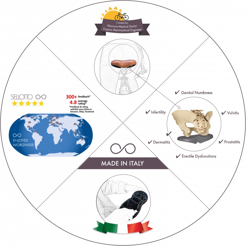 - GODITI la BICI – Sogni di ridurre i rischi di fastidi e dolori dei tradizionali sellini bicicletta (Intorpidimento genitale, Prostatiti, Vulviti, Dermatiti)? Investi in salute con “sellOttO”, la sella bici che “non schiaccia l’ area genitale”: al piacere del ciclismo si unisce un benessere fisico. Ideata pensando a stile e comfort, raccomandata dalla Medicina Sportiva per uomo e donna, nello Sport e nel Tempo Libero; se il peso del ciclista è maggiore di 100 kg, contattateci prima dell' ordine.