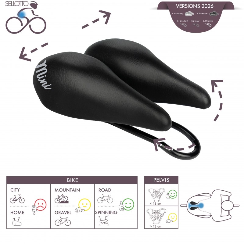 • MINI – Prima ed unica doppia sella corta "triangolare" (brevettata), completamente Regolabile (agendo su una coppia di viti, presenti all' interno di ciascuna semisella), cosi da personalizzare la sella sulla propria corporatura, uso della bici, e larghezza delle proprie ossa ischiatiche (il bacino stretto – larghezza ossa ischiatiche < 13 cm è normalmente presente negli uomini; il bacino largo – larghezza ossa ischiatiche > 13 cm è normalmente presente nelle donne; un suggerimento da Selle SMP per la misurazione della larghezza delle proprie ossa ischiatiche). Ammortizzazione alternata (grazie al binario di supporto prodotto con acciaio per molle), sia per assecondare la gamba in estensione (con il leggero abbassamento elastico della relativa semisella), sia per aiutare la gamba in flessione (con il ritorno elastico della relativa semisella); il bacino deve essere appoggiato solo negli ultimi 8 cm posteriori della sella. Rivestimento in finta pelle leggermente ruvida, per assicurare una maggiore stabilità del bacino del ciclista. Installabile su qualsiasi Reggisella Standard (binari di forma circolare, con diametro di 7 mm, e distanza interna di 36 mm).